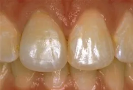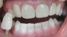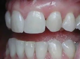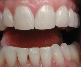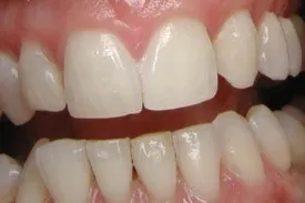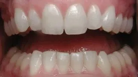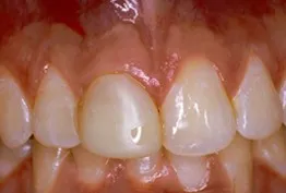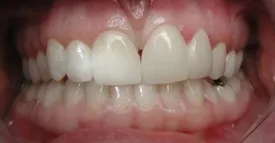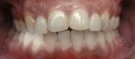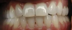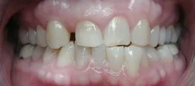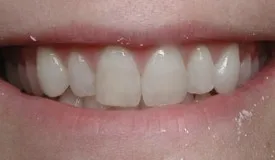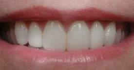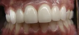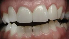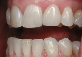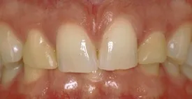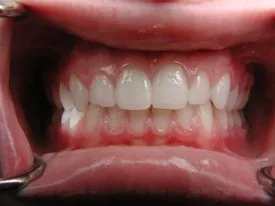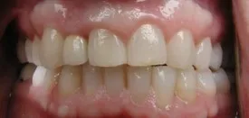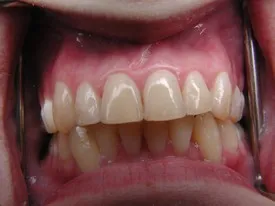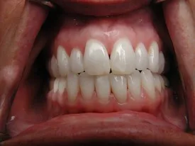 Before: Front (left) Central tooth has a poor restoration. Does not look natural and is not contoured properly to match the gumline of the rest of the teeth.