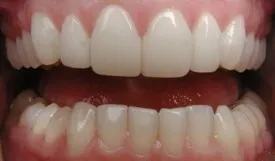 After: Smile restored with 6 Upper Anterior Crowns that are properly shaped, gumline is uniform, and color/shade is the same for all 6 incisor teeth.